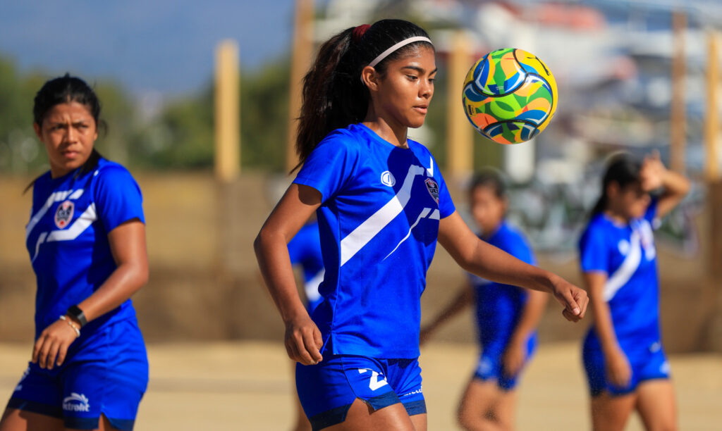 Las representantes de la Universidad de El Salvador hicieron su práctica con buena actitud y muy enfocadas en seguir las indicaciones del entrenador Rafael González, quien las guió para trabajar activación general, acoplamiento al terreno de juego, trabajo de porteras y definición.