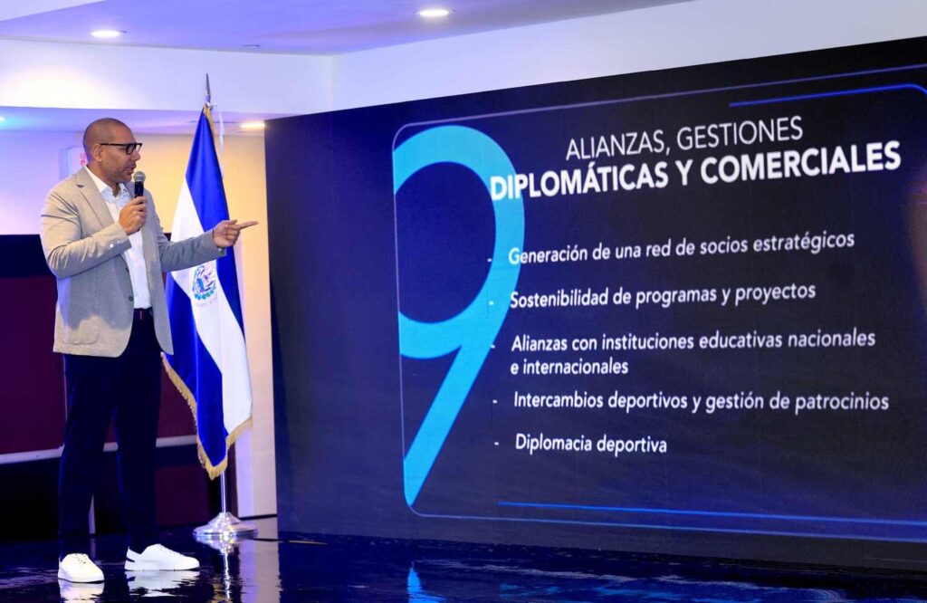 9- Alianzas, gestiones diplomáticas y comerciales: este eje impulsará una red de socios estratégicos, garantizará la sostenibilidad de programas y proyectos, fomentará acuerdos con instituciones educativas nacionales e internacionales, y abrirá espacios para intercambios deportivos y diplomacia deportiva.