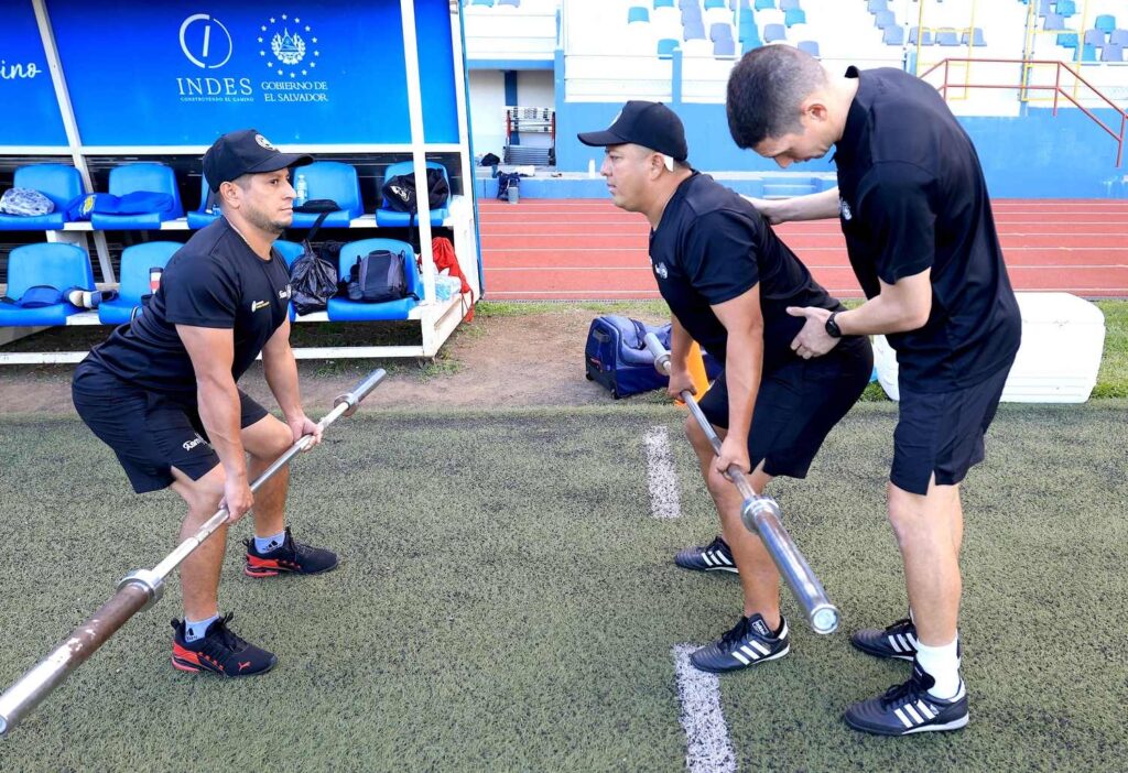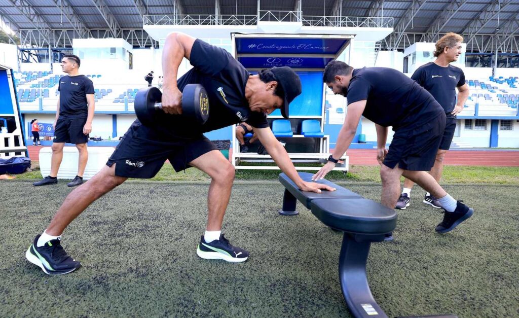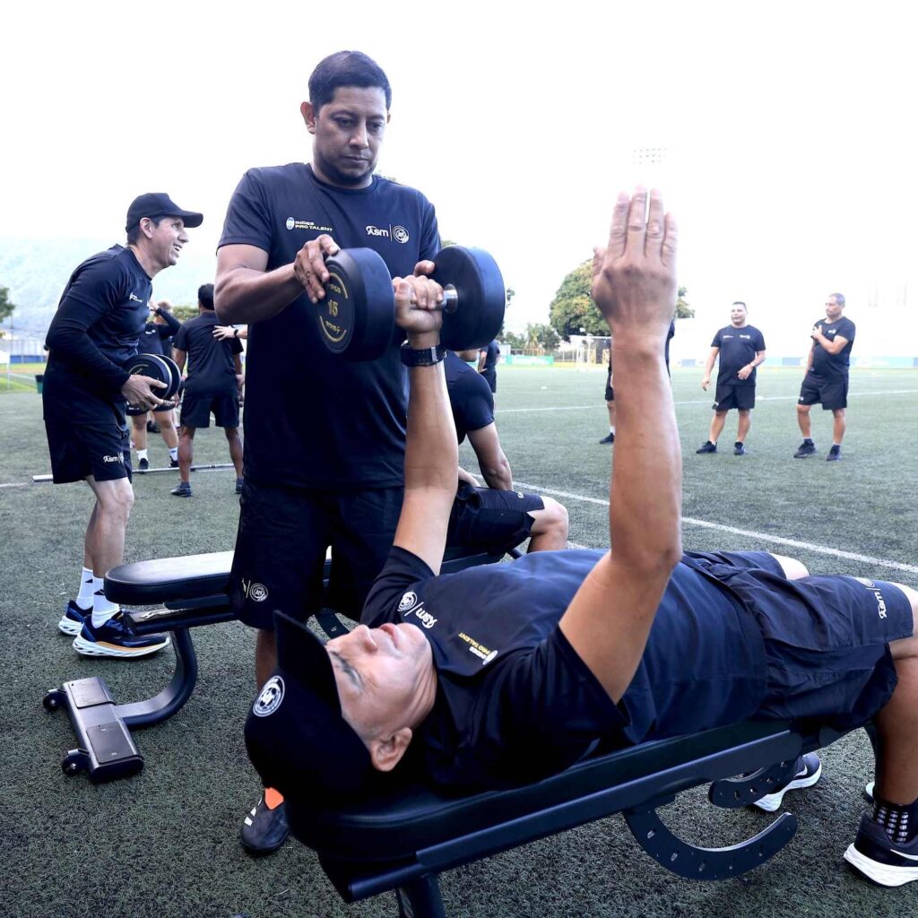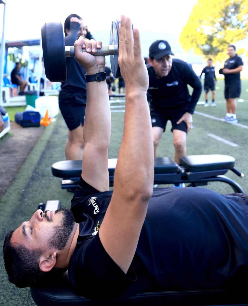 La jornada incluyó calentamiento y ejercicios de fuerza con mancuernas, enfocados en el tren superior, así como tareas específicas como remo y zancadas, fortaleciendo la preparación práctica de los entrenadores para que puedan transmitir estos ejercicios a sus jugadores.
