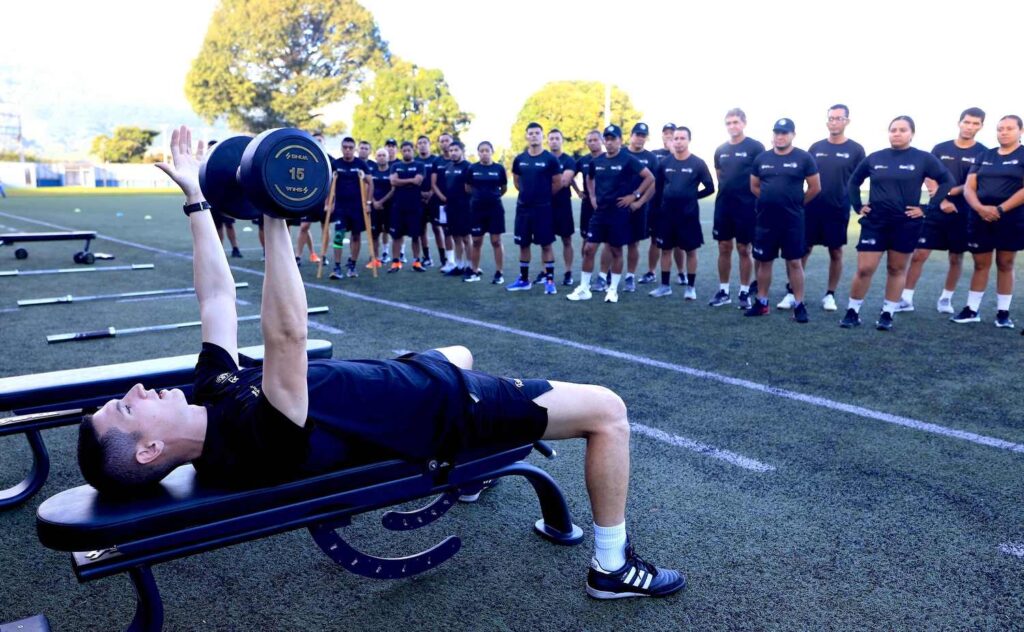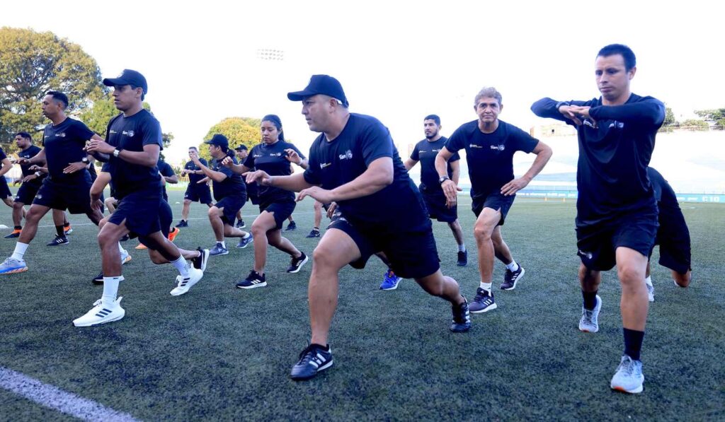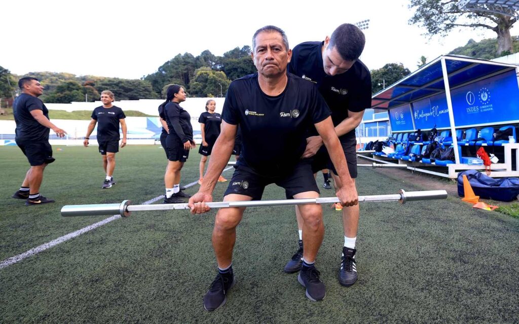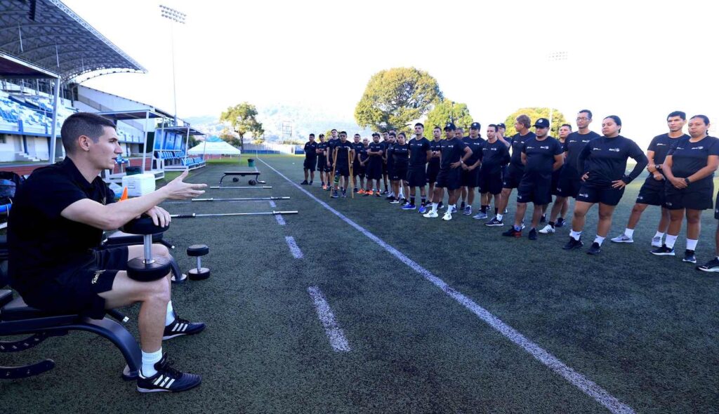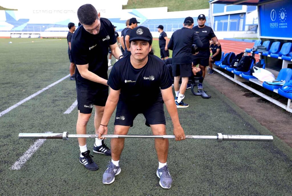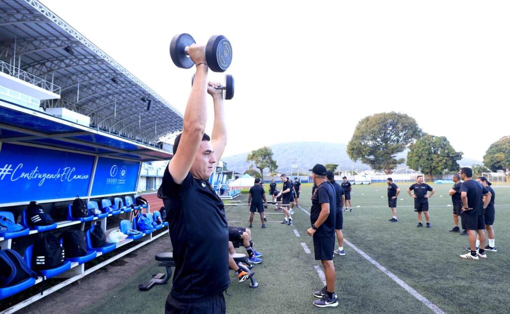 La jornada incluyó calentamiento y ejercicios de fuerza con mancuernas, enfocados en el tren superior, así como tareas específicas como remo y zancadas, fortaleciendo la preparación práctica de los entrenadores para que puedan transmitir estos ejercicios a sus jugadores.
